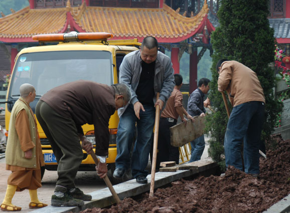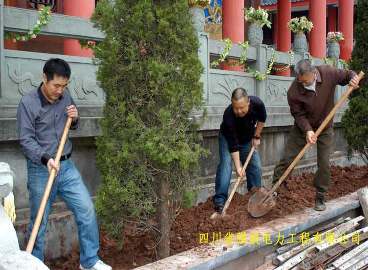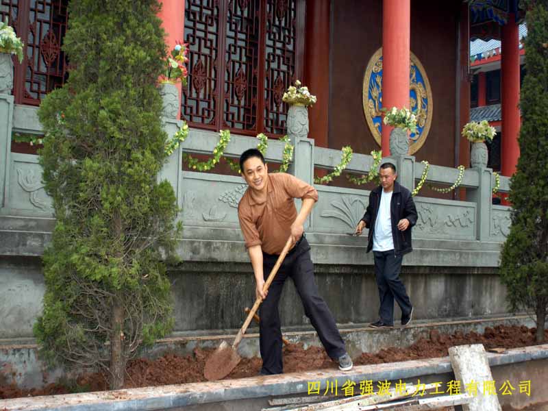 2009年10月21日的早晨,初秋的涼意陣陣襲來,小雨淅淅瀝瀝的飄落著。在公司領導的帶領下我們一行5人前往蓬溪明月小鎮,高洞尼姑庵植樹祈福。來到高洞尼姑庵山門下,一陣悠揚的鐘聲和誦經聲從遠處傳來,只見山門前婷婷屹立著兩棵蔥天黃桷樹,遠處看去如蓮花般綻放,讓人肅然起敬。進入山門,大師聽到我們的來意后,齊誦“啊彌陀佛”迎接我們的到來。在公司董事長孫總的領頭下,我們揮動鐵揪、鋤頭,搬的搬、抬的抬,大家都發揚了不怕苦不怕臟的精神。把6棵綠油油的蒼天松柏種植在大雄寶殿兩旁。此刻不知是天公作美還是植樹的懺誠善行感動了佛菩薩,太陽也從云縫中露了笑臉,萬道霞光如佛光普照大地,讓人心中暖意洋洋。大雄寶殿在粗壯的松柏樹的陪襯下更加栩栩生輝、金壁輝煌、雄偉壯觀、靈氣倍增。下午,在高僧們的帶領下,我們站在自己剛種下的樹前,聆聽做人的道理。世上的一切福報惡果,乃至于自生在人世上的起心動念,踐行的善惡言行,都會得到該有的報應,善待眾生樂于助人,誠信經營其道理。使我們深受啟發,讓我們找到了一個做人的方向和目標。隨后在孫總的帶領下,我們十指合掌在佛菩薩面前,齊為公司戰斗在全國各地的工程處、項目部祈福,祝他們在外工程施工安全平安、家庭幸福美滿、大吉大順、也為天下眾生祈福平安! 文字撰稿人:潘國禮 2009年10月22 圖片整理:黃心熠